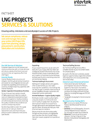 Utilizing technical expertise that extends from cutting-edge technology to real world experience, our diverse services and capabilities enable us to provide significant quality and cost-saving solutions. By taking a proactive risk-based approach to quality control programs, we help you avoid costly projects delays that can occur as a result of potential problems such as equipment failure, component defects, safety incidents and more. From planning, design, procurement and fabrication to construction, installation, commissioning and operations, Intertek’s end-to-end LNG services help ensure your projects are safe and successful.